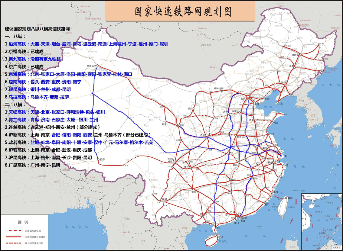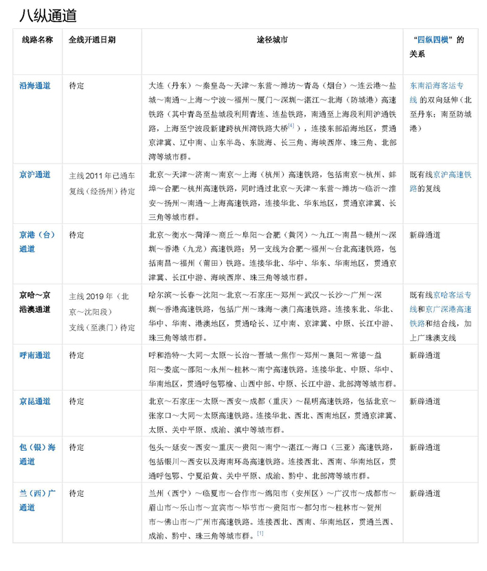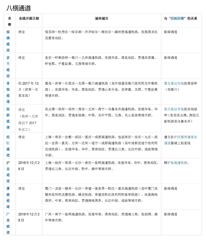 "八縱八橫" 是中國高速鐵路網絡的短期規劃圖。20167月,國家發展改革委、交通運輸部、中國鐵路總公司聯合發布了《中長期鐵路網規劃》,勾畫了新時期“八縱八橫”高速鐵路網的宏大藍圖。  “八縱”通道包括沿海通道、京滬通道、京港(臺)通道、京哈~京港澳通道、呼南通道、京昆通道、包(銀)海通道、蘭(西)廣通道。“八橫”通道包括綏滿通道、京蘭通道、福銀通道、青銀通道、陸橋通道、沿江通道、滬昆通道、廈渝通道、廣昆通道。